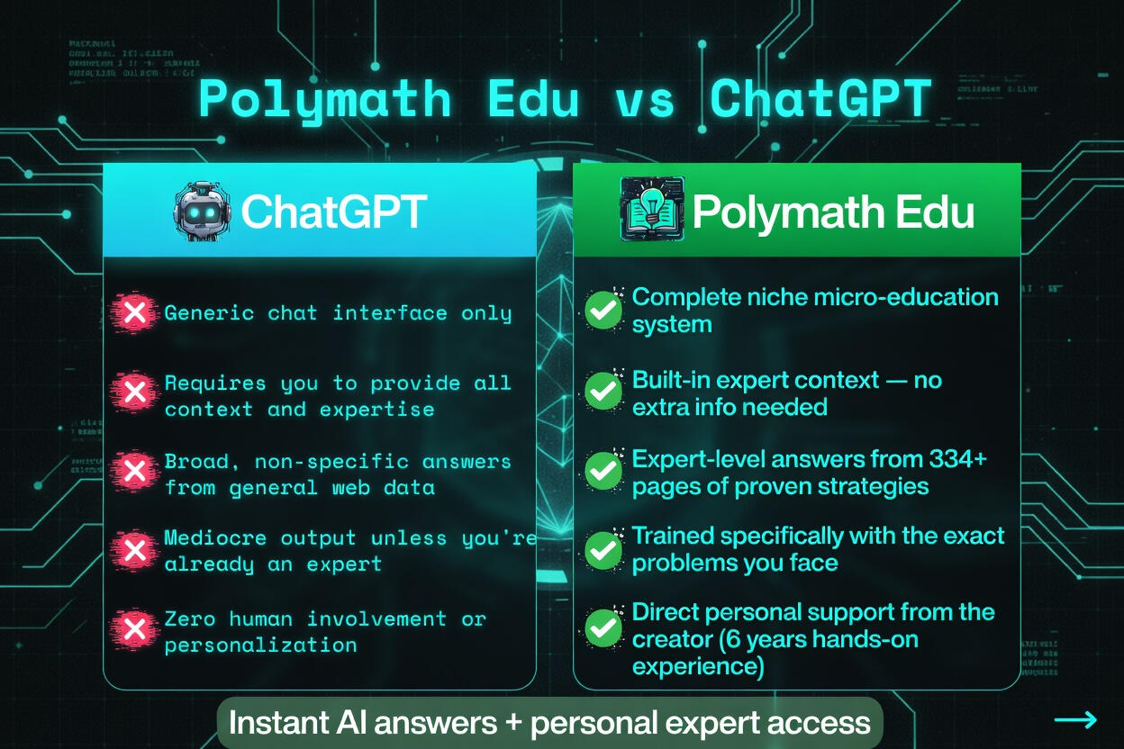 Nobody to help you: DPU is as much a coaching community as it is a vast curriculum designed to answer all your questions, meaning if you get stuck, just ask your questions inside and get your answer from me specifically, no matter how complex it is, if for some reason Polymath Edu did not give you a sufficient answer